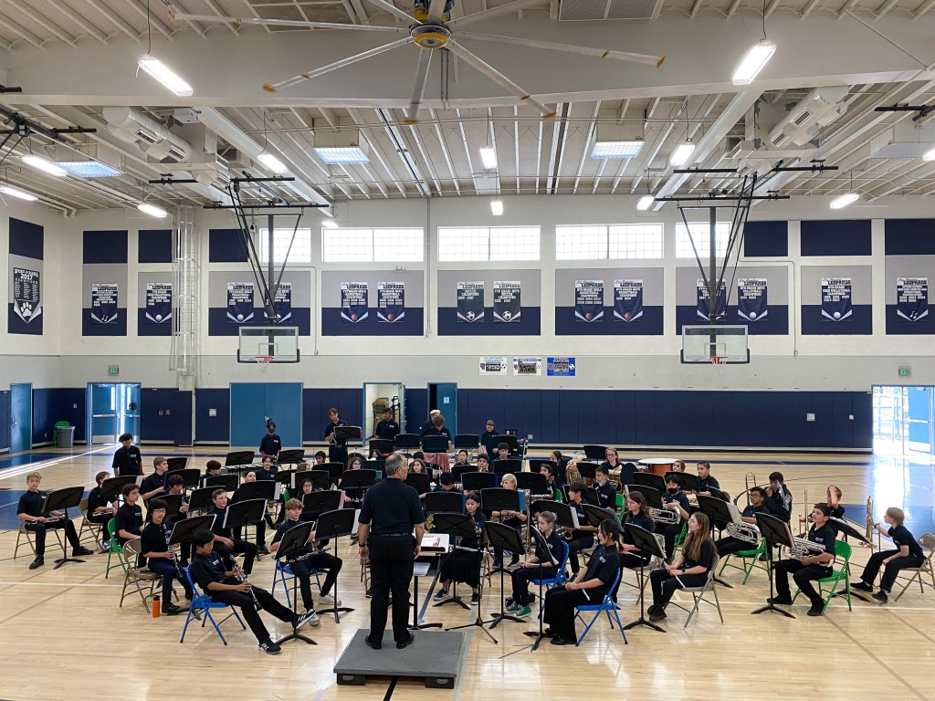 The advanced band getting ready to play. These are all 7th and 8th graders. Because there is a need for more deep base, a high school tuba player joined the performance. Mr. Freed noted that he could hear Quinn play louder than the high schooler (that’s a good thing).