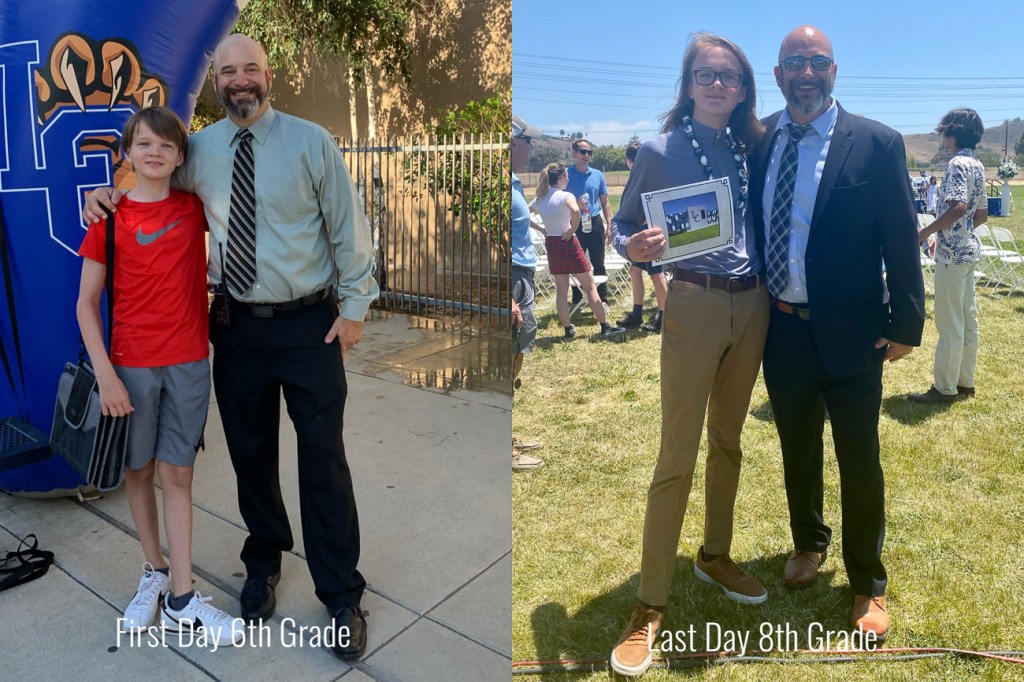 A picture with his principal on the first day of 6th grade and last day of 8th grade. Some things have changed.
