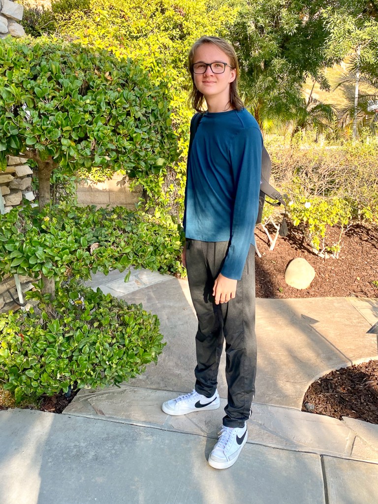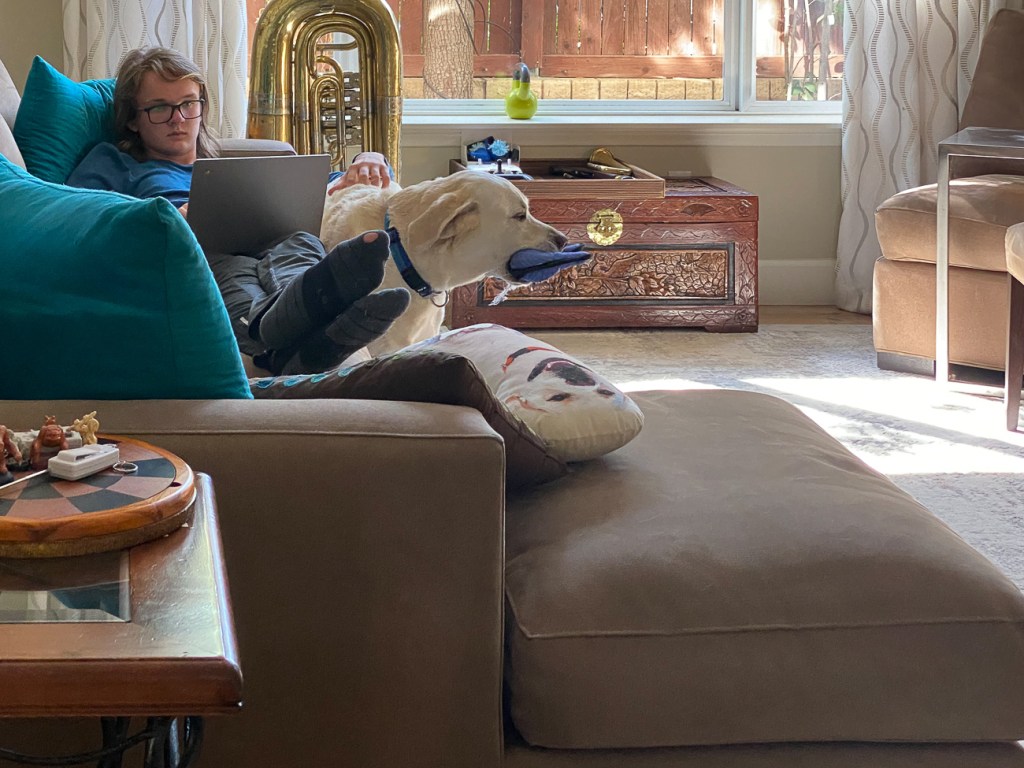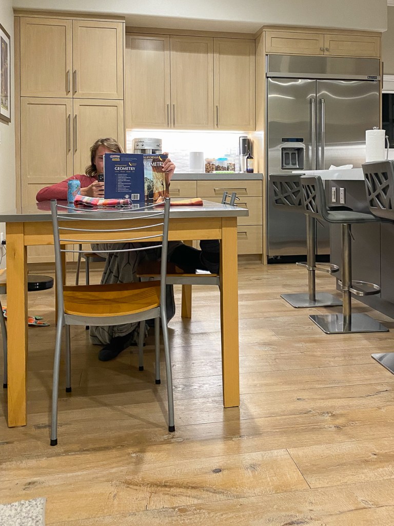On his 2nd day of school, he had Marching Band practice right after school from 3:45 – 6:45 pm. Home for dinner and homework which was 40 geometry problems. This photo was taken at 8:52 pm. The new normal isn’t much fun.