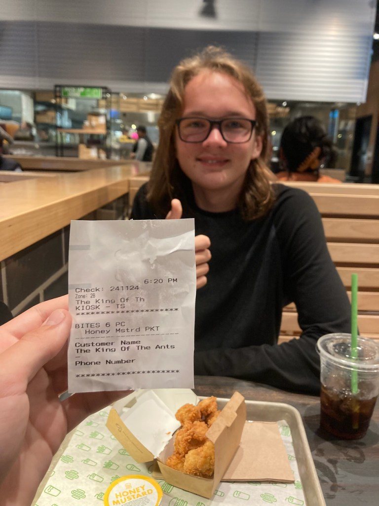 I love that Quinn sometimes sends me funny texts and/or pictures. At Shake Shack there are ipads where you place your order and enter your name. Notice Customer Name: The King of the Ants. Funny guy!