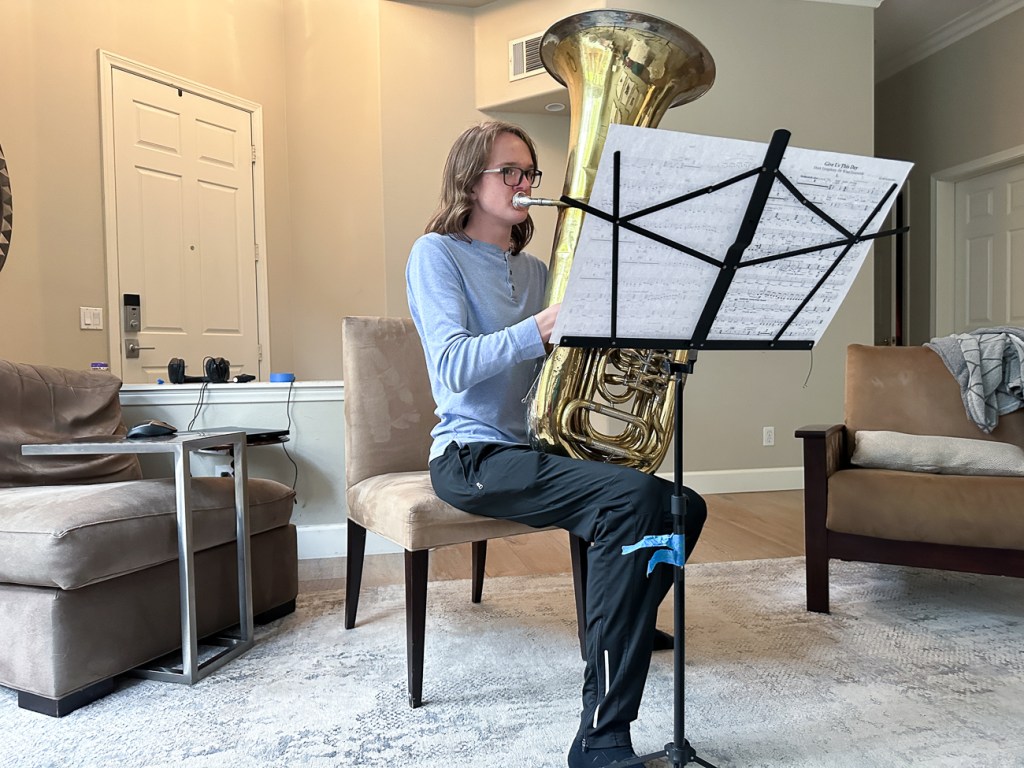 Our tuba guy. The school performed at a local music festival and were scored an Outstanding. And a rare occurrence of our tuba player practicing.