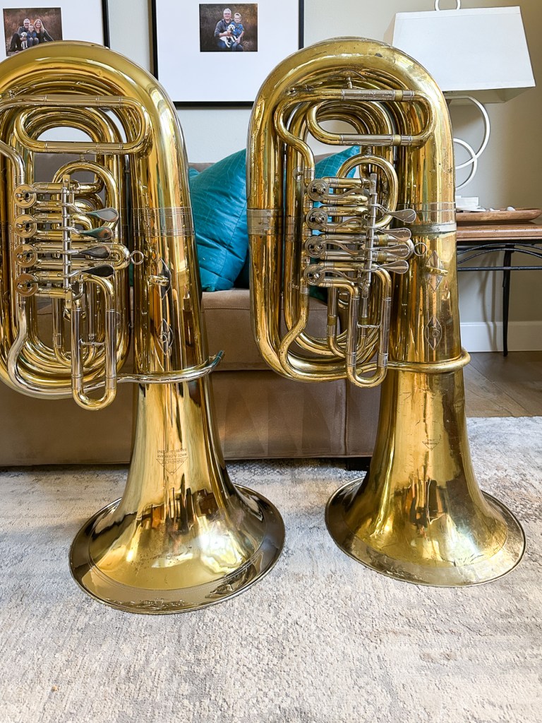 Quinn has a tuba of his own, now affectionately known as Nicholas Cage (every tuba player must name their tuba). He’s currently borrowing a tuba from his tuba tutor, Mr. Freed, and he loves the tuba. It’s a German made tuba called a Miraphone 186 and is the perfect size for our tall guy with a deep, dark sound. But it’s only on lend while he is tutoring with Mr. Freed so we wanted Quinn to have a tuba of his own.