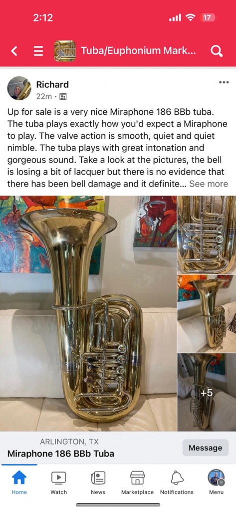 Like I said, we have been looking for a used tuba for about a year, and specifically for a Miraphone 186. I joined a “Tuba Resale” Facebook group and had made a couple of offers that didn’t go through. Mr. Freed had also been looking for us and Sunday morning he sent me a link to one that was just posted. It looked perfect!
