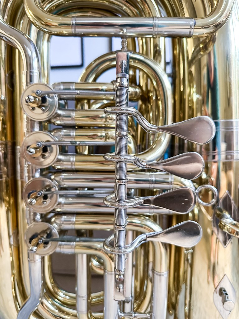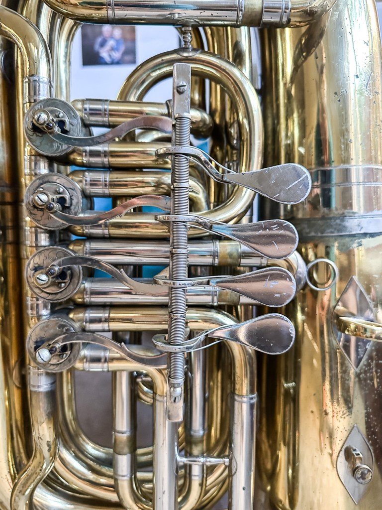 Quinn was beyond excited with how easily the valves/keys moved and how little sound they make. The newer tubas are machine made where the older ones are hand made. The main giveaway is the curved levers that you can see on Mr. Freed’s tuba on the right.