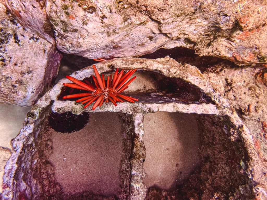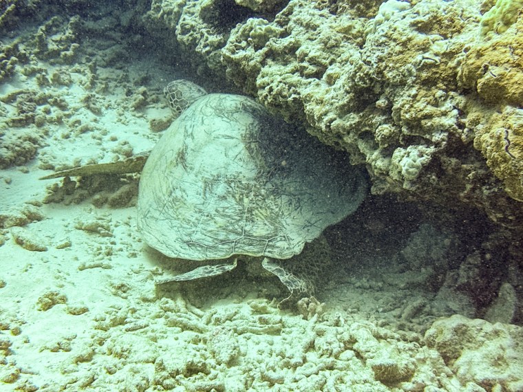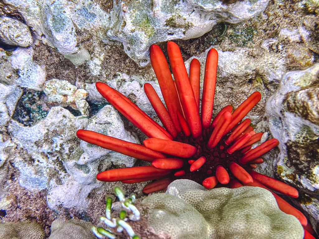It was Easter Sunday so the Conrath’s went off to church while we went snorkeling. Some of the best snorkeling on the island was only a couple of minutes from us at Electric Beach. I got a scuba diving case for my iPhone and finally got to try it out. I thought it did a pretty good job. The red urchin was new to us — it’s called a Ha‘uku‘uku‘ula‘ula or Red Pencil Urchin. That was about 8 feet underwater so I think the iPhone did good.