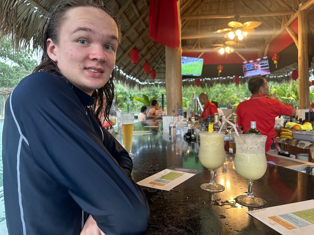 We got back to the hotel right at happy hour so we hit the thermal pool with the swim up bar. Quinn ordered his 2-for-1 Pina Colada and this is the moment he realized that they had rum in them. Oh well, I guess mom is drinking Pina Coladas.