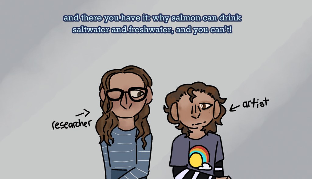 Quinn and a classmate worked on a project in Biology where Quinn did the research and she did the artwork. This was their last page and she captured Quinn so well in his favorite shirt — the whole presentation was great.
