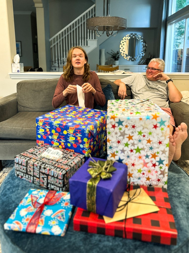Saturday was the Regiment competition and Sunday he had a tuba and a trombone lesson. So we had our family celebration on his birthday, Monday. Checking out his loot!