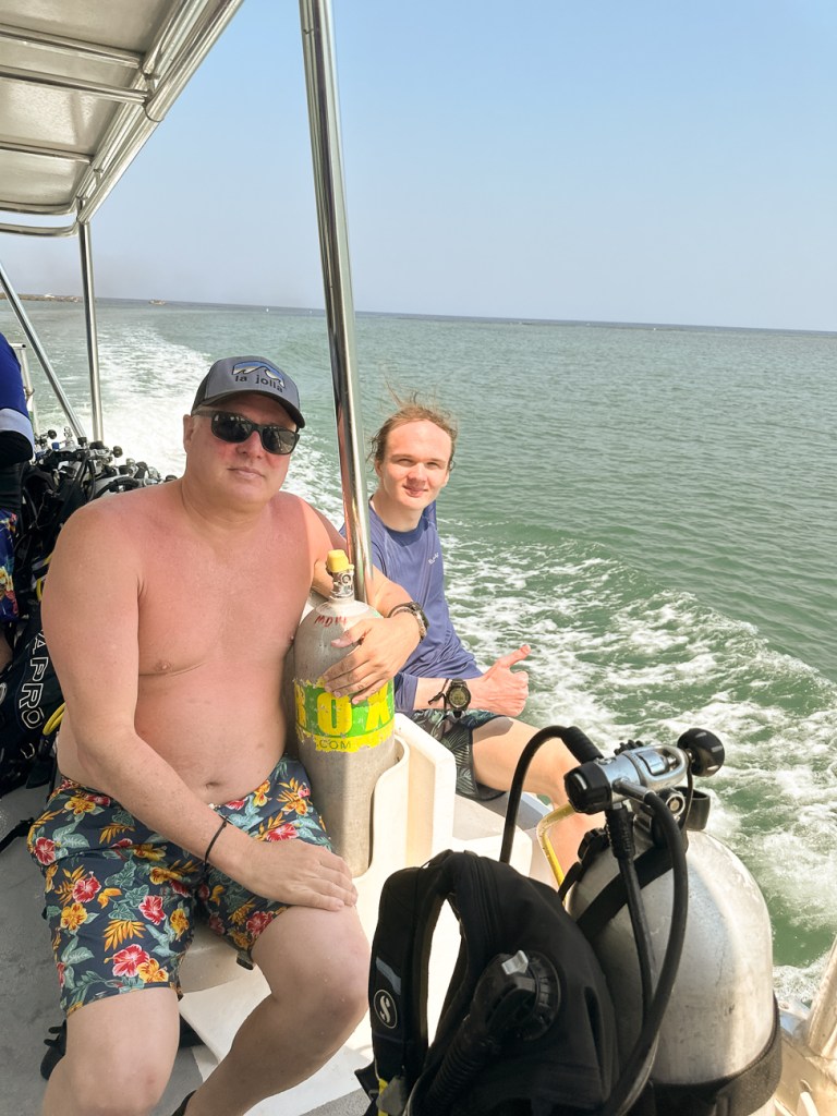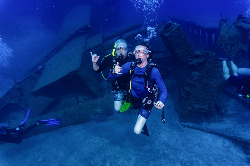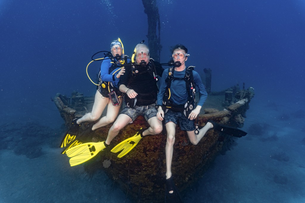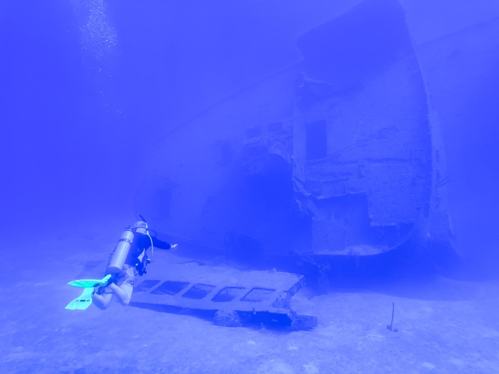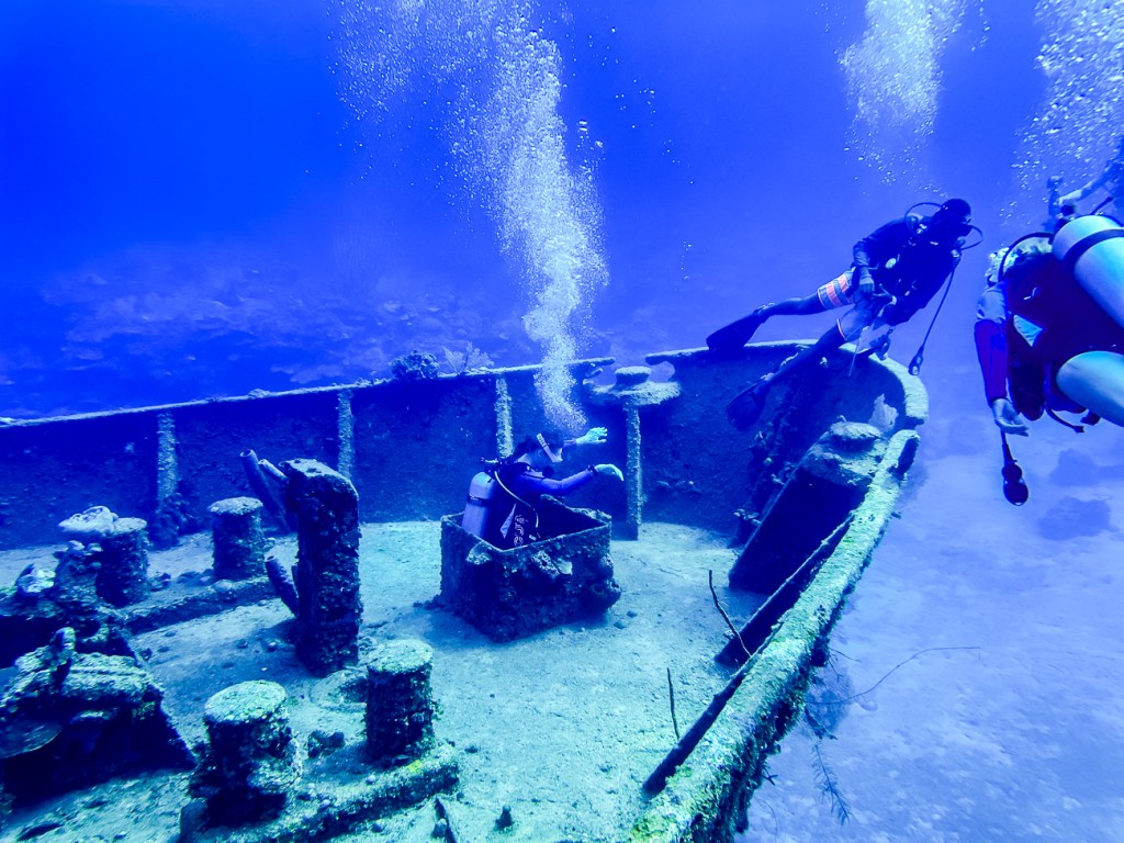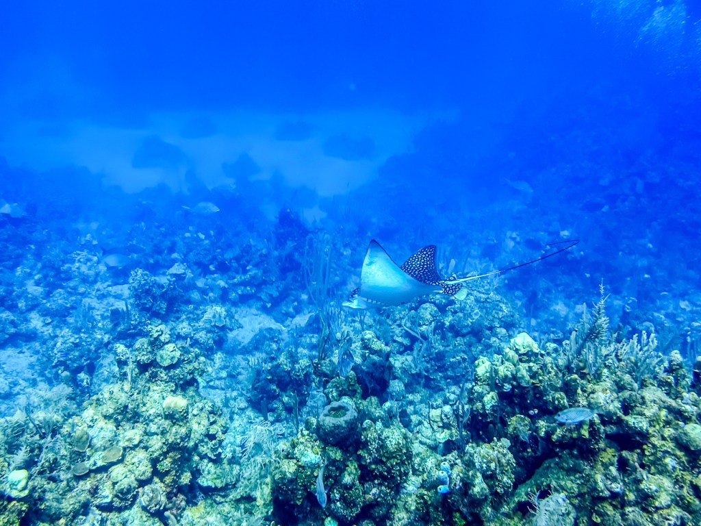 Quinn had to do a wreck dive for his Advanced Open Water Certification and we were lucky enough to go along with him. On the way down an Eagle Ray swam right by Don. The wreck was 104 feet down, which is really, really deep and we couldn’t stay at that depth very long.