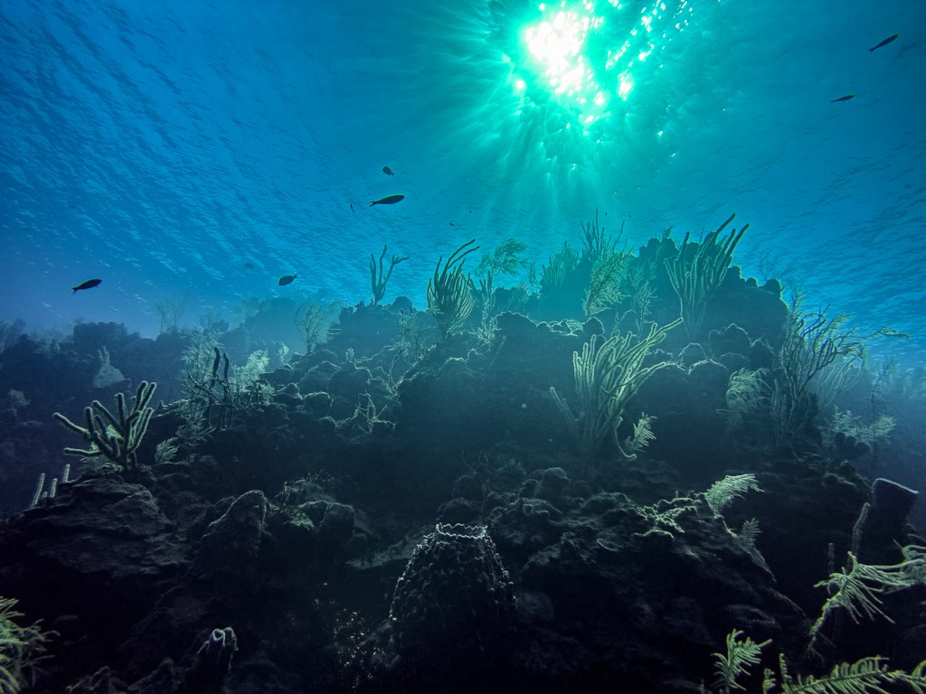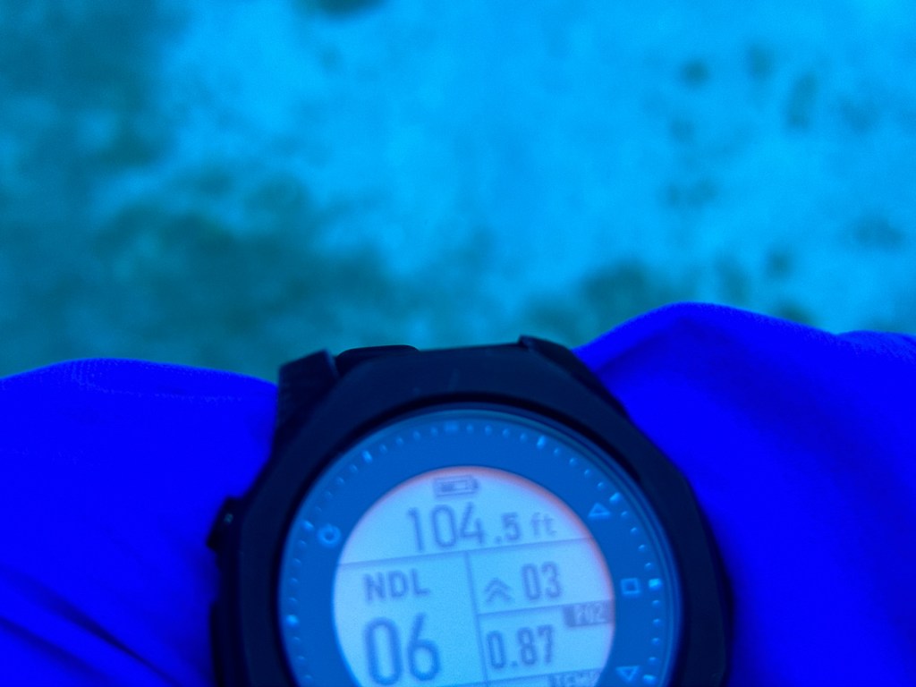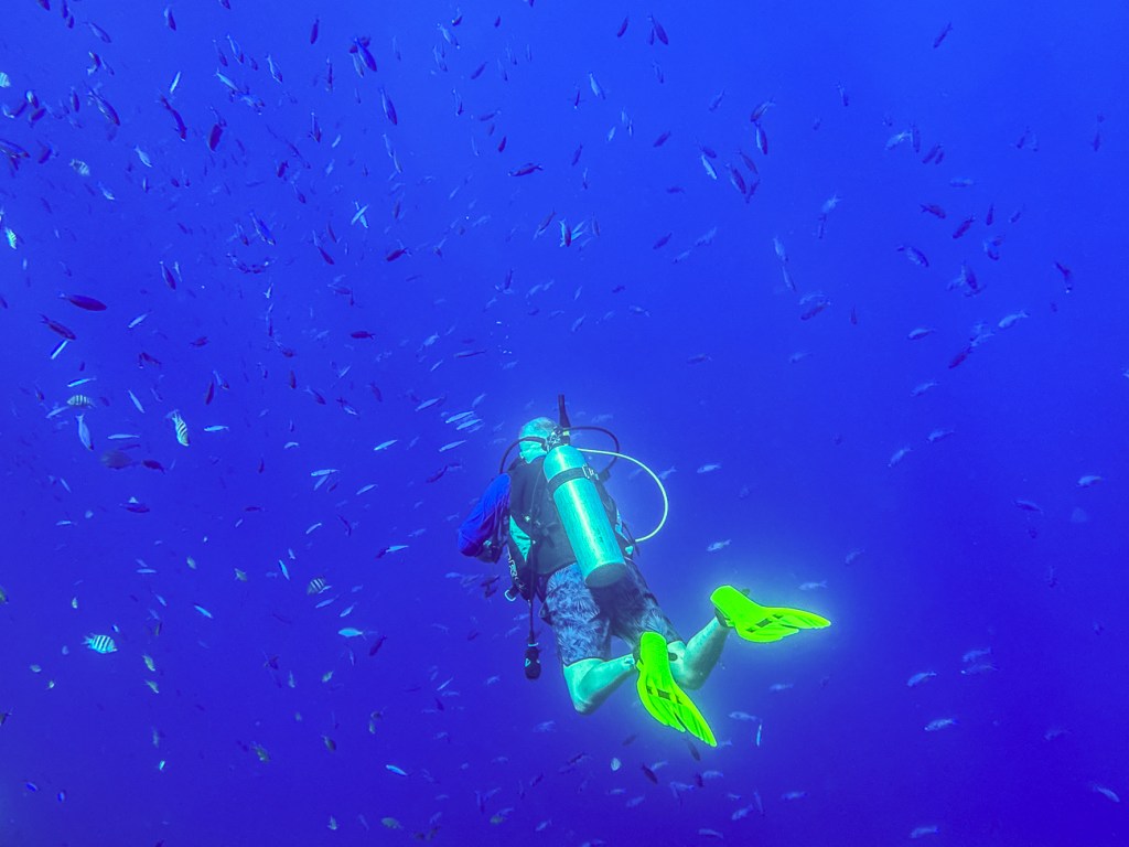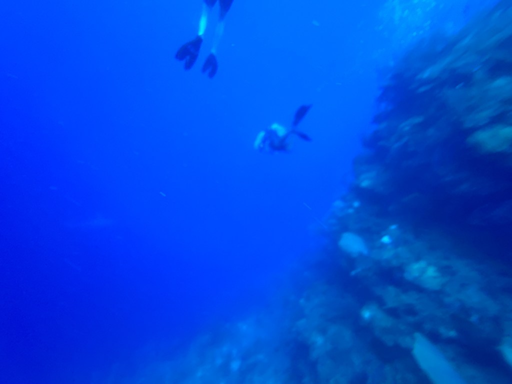 You have to look really closely here but a Hammerhead Shark swam right by us on our last dive. You can barely see a light sharky shape in the middle left of the picture.