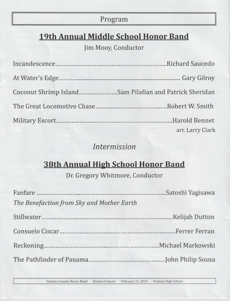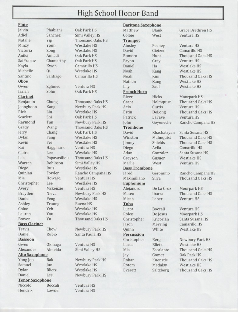 This is Quinn’s 4th year being selected to the Ventura County Honor Band and he always enjoys participating. They practice two evenings after school for 3 hours and then all day Saturday the day before the performance. This year 21 students from Westlake High School were selected.