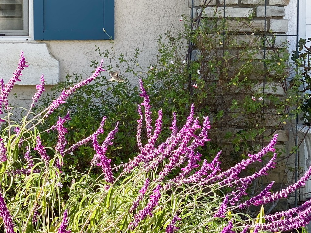 On my morning walk with Sonic I saw this hummingbird in a neighbors butterfly bush.