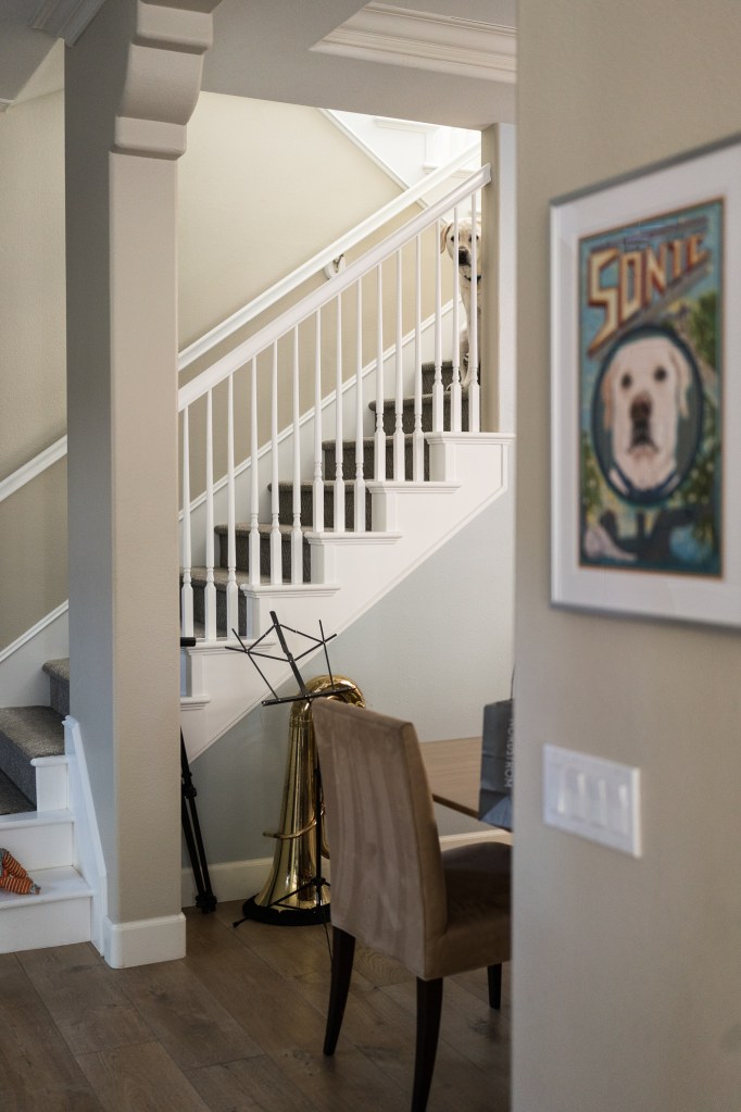 Sonic likes to follow me around the house, especially if there seems to be a walk in his future. But he will hedge his bets by sitting on the stairs so he can easily access upstairs and downstairs, depending on where I go.